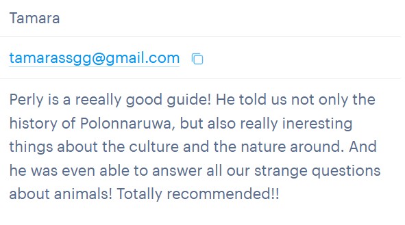 Each tour I lead is unique. I try to connect travelers with the spirit of the city, the surrounding nature, and the local community. Seeing visitors discover the stories of Polonnaruwa and leave with a deeper understanding of its past is what I enjoy most.