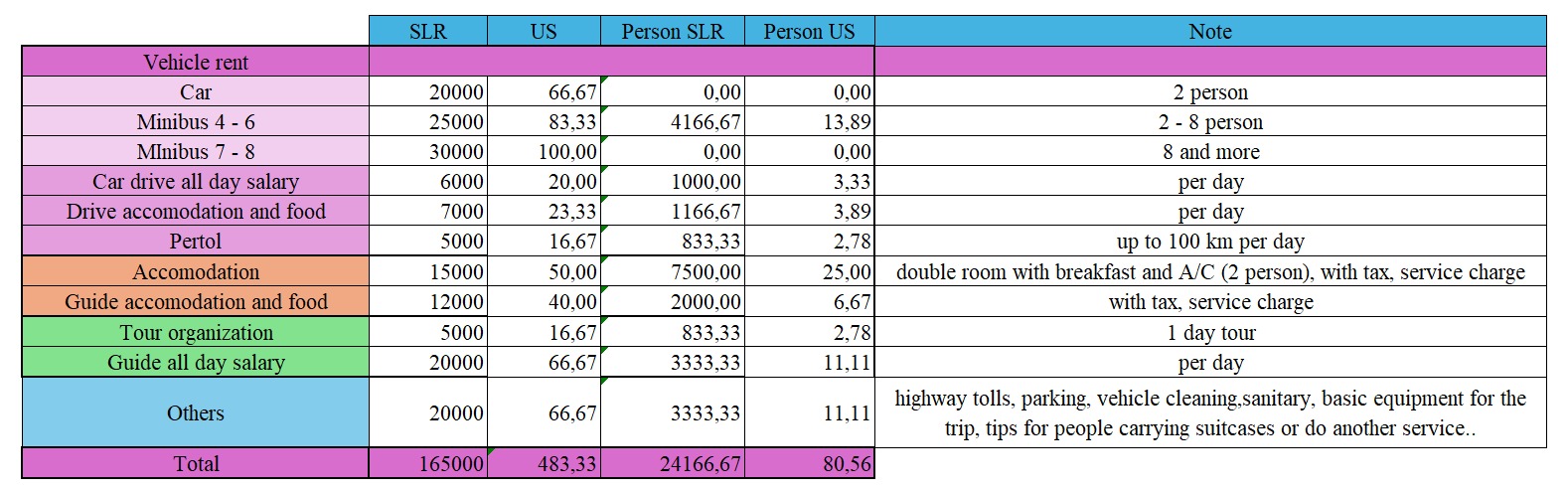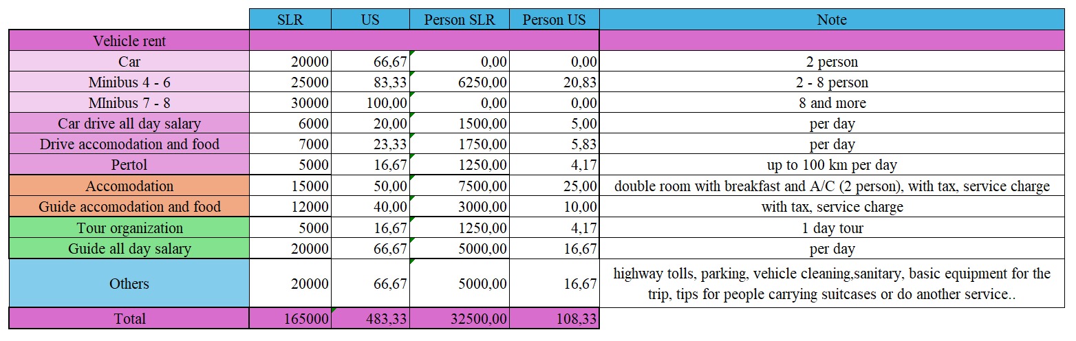 Price list - Transport, Guide, Accomodation - with breakfast, A/C, all services